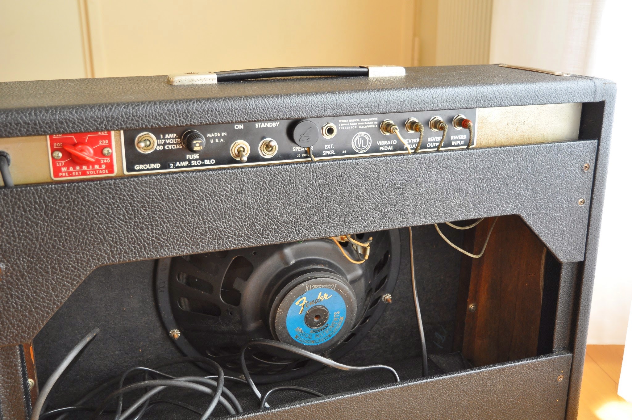 The cabinet is a 1966 original cabinet. Original pinstripe and tolex strap handles cabinet